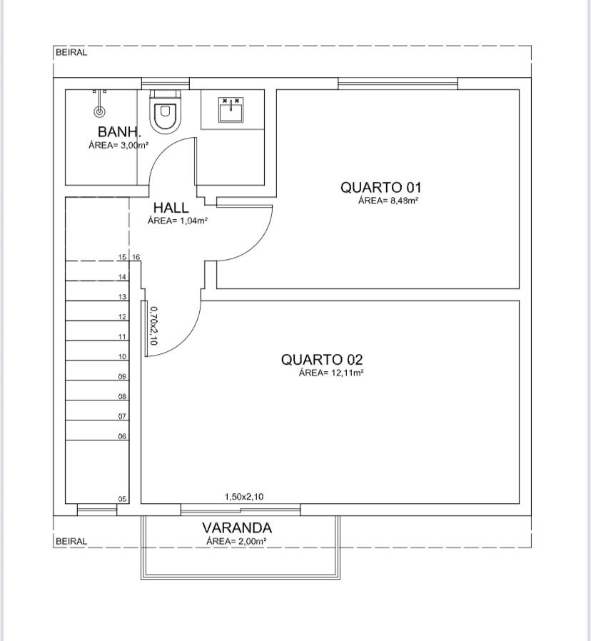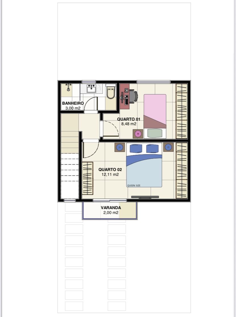 A casa será composta de 2 Quartos em cima com 1 banheiro social, sendo 1 quarto com sacada.