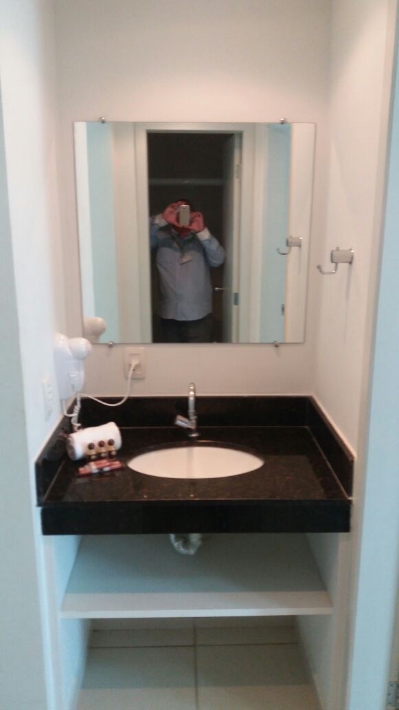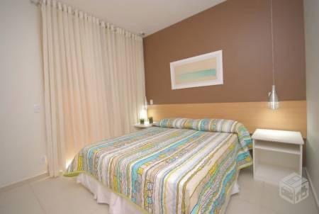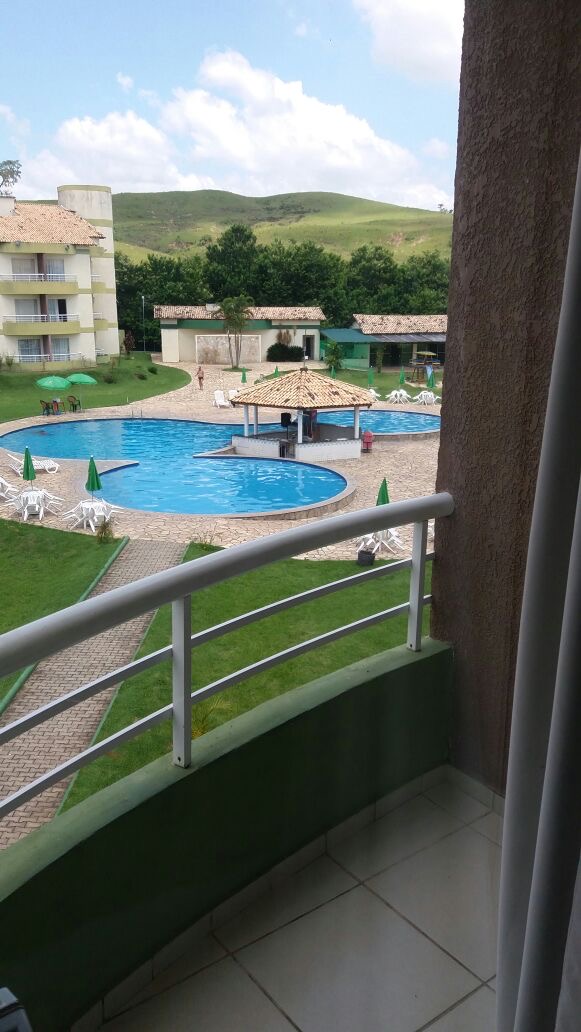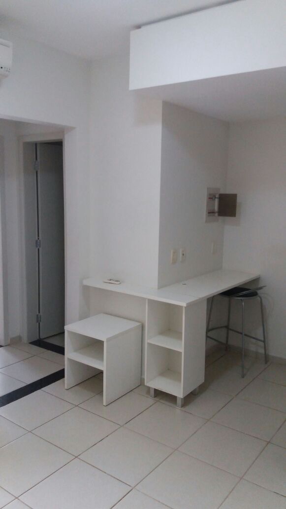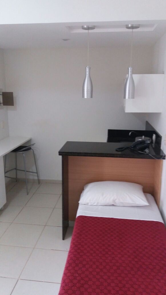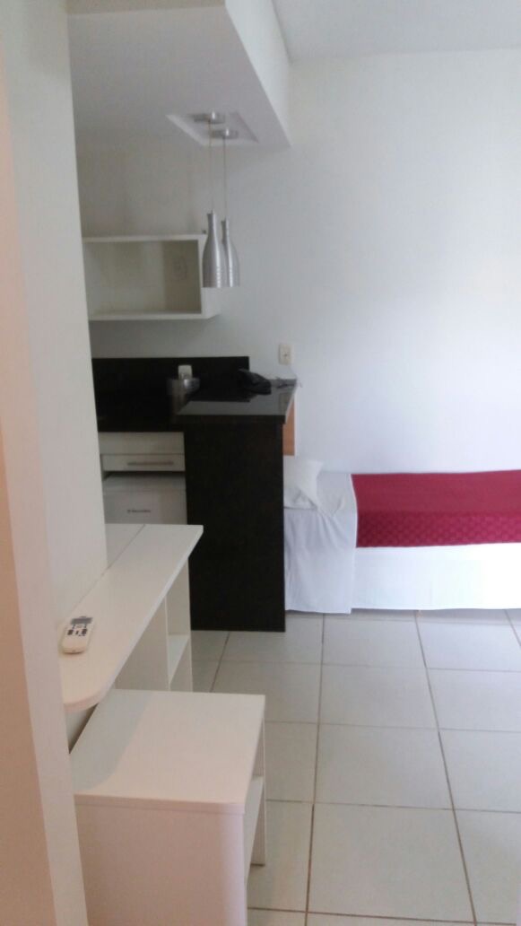 Flat de frente para a piscina,cozinha americana, sala com sacada e o quarto também possui sacada.